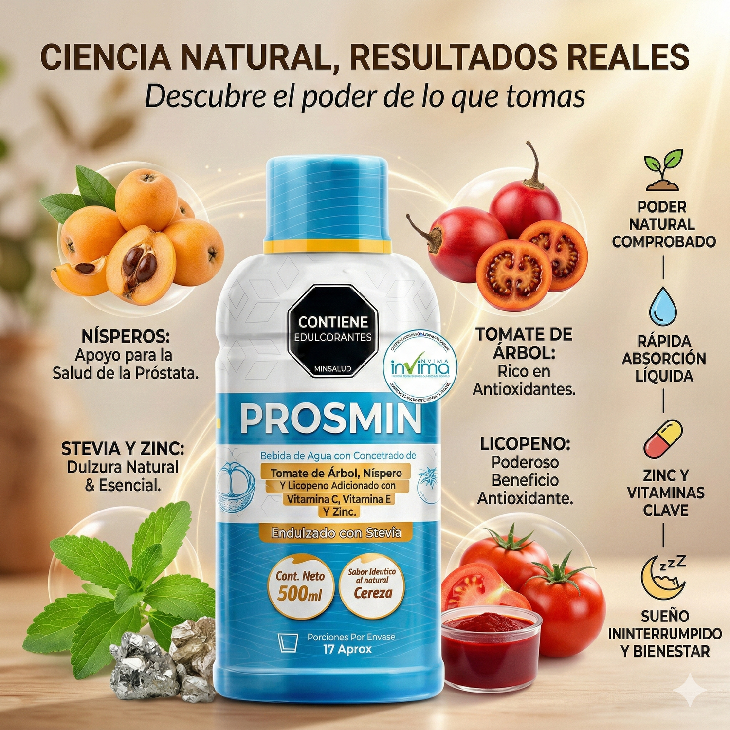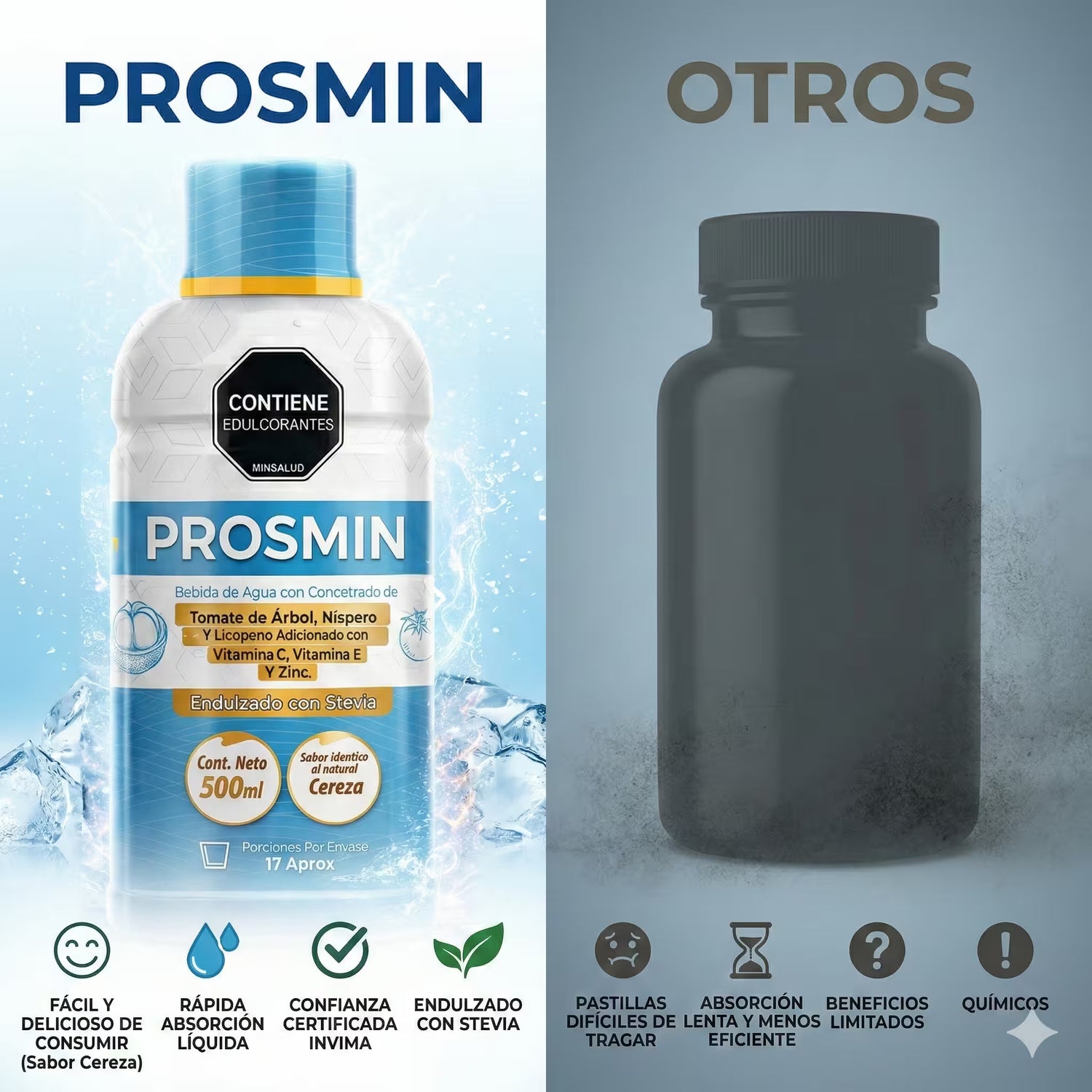 Olvídate de esas cápsulas gigantes que tardan horas en deshacerse en el estómago. Al ser un concentrado 100% líquido, tu cuerpo absorbe los nutrientes de PROSMIN de forma casi inmediata. Además, su delicioso sabor a cereza (endulzado con Stevia) hace que cuidar tu salud sea un placer diario.